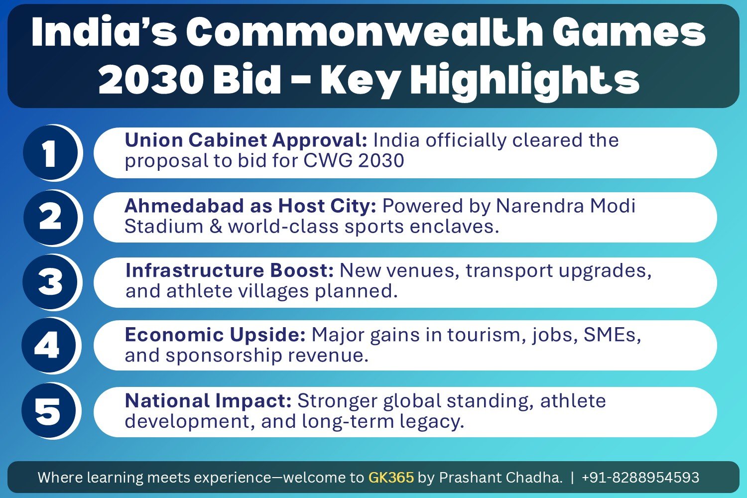 | Government Decision | Union Cabinet approved India’s bid for CWG 2030, with central–state collaboration. |